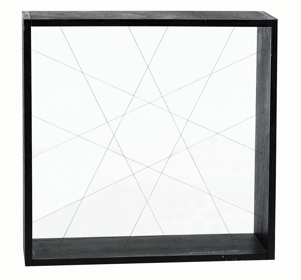 MANFREDO MASSIRONI Padova 1937 - Senza titolo, 1961, legni e fili cm. 50x50x15, firma e anno all'interno in basso a destra.