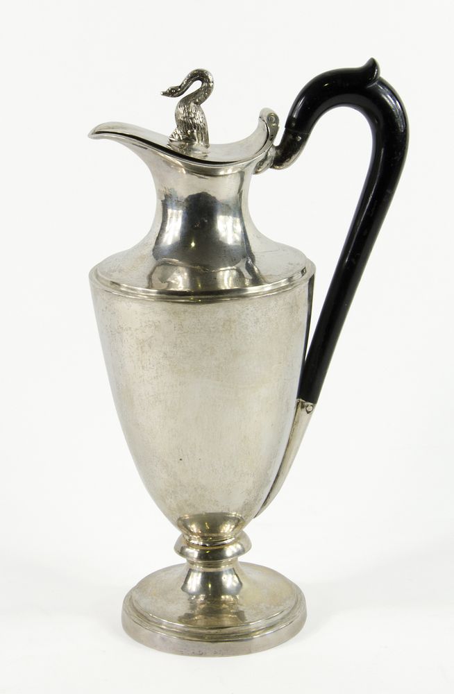 Grande brocca in argento con manico in legno, sul coperchio figura di cigno. Punzone Vienna fine XVIII secolo, il cigno reca il punzone Minerva. H. cm. 33. gr. Tot 900.