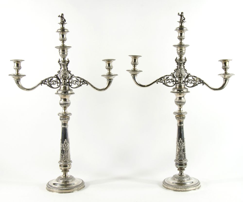 Coppia di grandi candelabri in argento finemente lavorati a sbalzo a palmette e motivi floreali, braccia traforate con figure di angeli. Punzoni Lombardo Veneto Milano. H. cm. 63. gr. tot 2100.