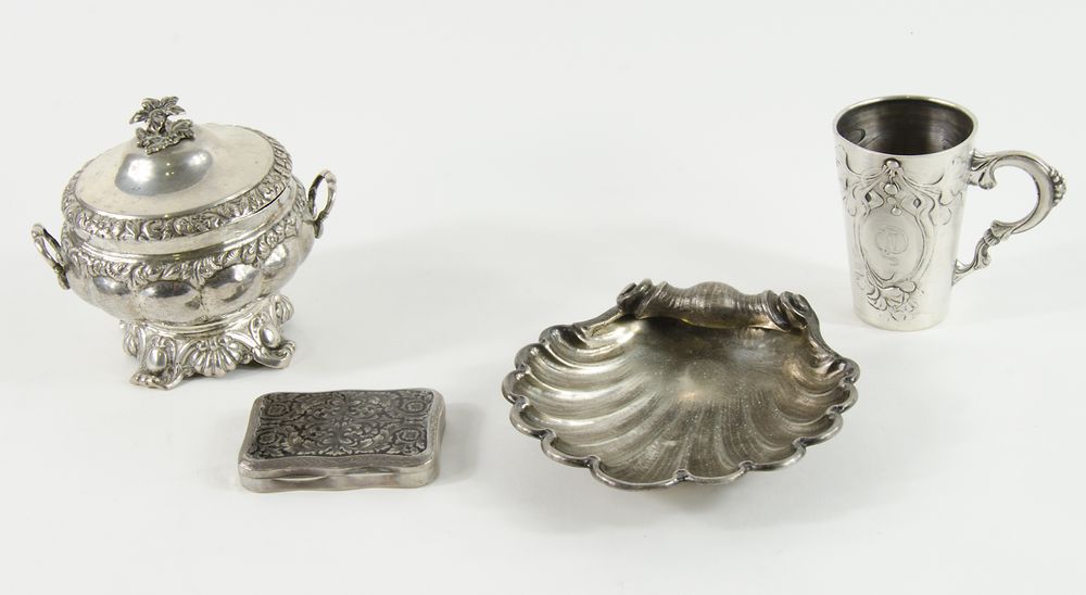 Lotto di 4 oggetti in argento tra cui zuccheriera e scatoletta. Gr. tot 600.