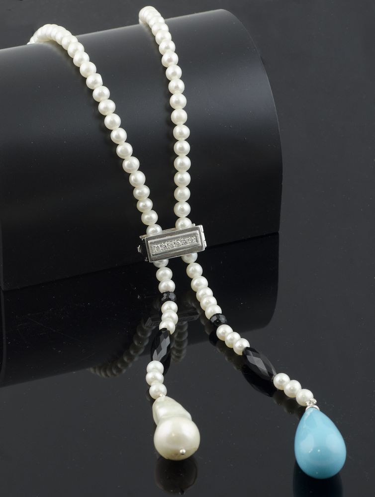 Collana ad un filo perle Akoya mm6 con inserti in onice con finale di turchese a goccia e perla barocca, chiusura regolabile in oro bianco con diamanti taglio brillante