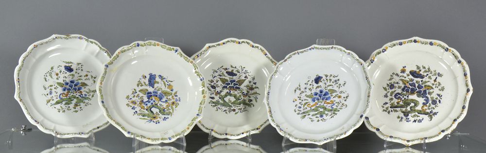 Lotto di 5 piatti in maiolica decorati a ponticello. Manifattura Antonibon Nove, circa 1770. Diam. cm. 24.