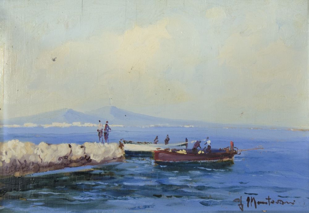 Guido Mantovani 1916-? "Pescatori" cm. 23x33 - olio su tavoletta Firmato b. a...