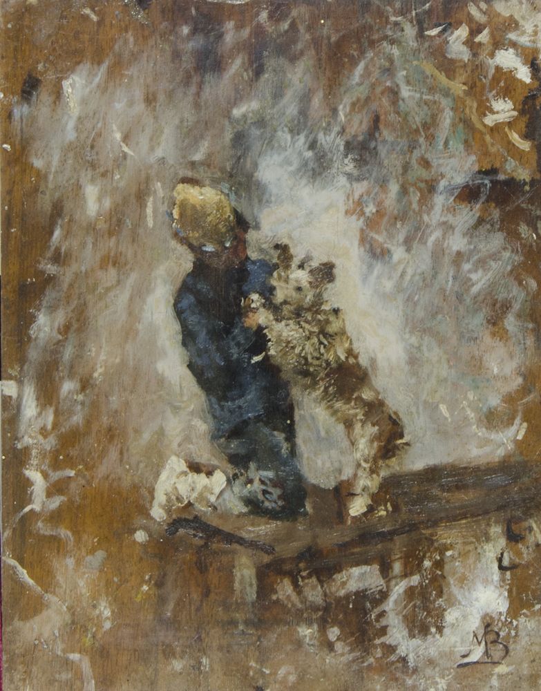 Mosè Bianchi 1840-1904 "Bambino con cane" cm. 32x24 - olio su tavola parchettata Siglato b. a d. Al retro etichetta Galleria Italiana d'Arte Milano.