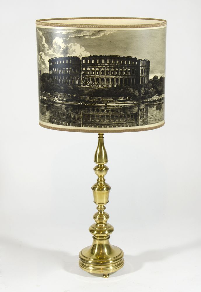 Lampada da tavolo in ottone con paralume stampato raffigurante Arena di Pola...
