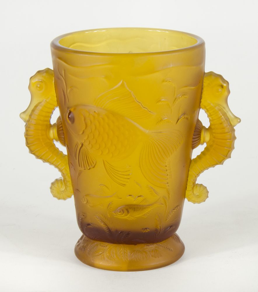 Vaso in vetro lattimo giallo decorato con figure di pesci, manici a forma di cavallucci marini. H. cm. 18.