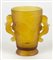 Vaso in vetro lattimo giallo decorato con figure di pesci, manici a forma di...