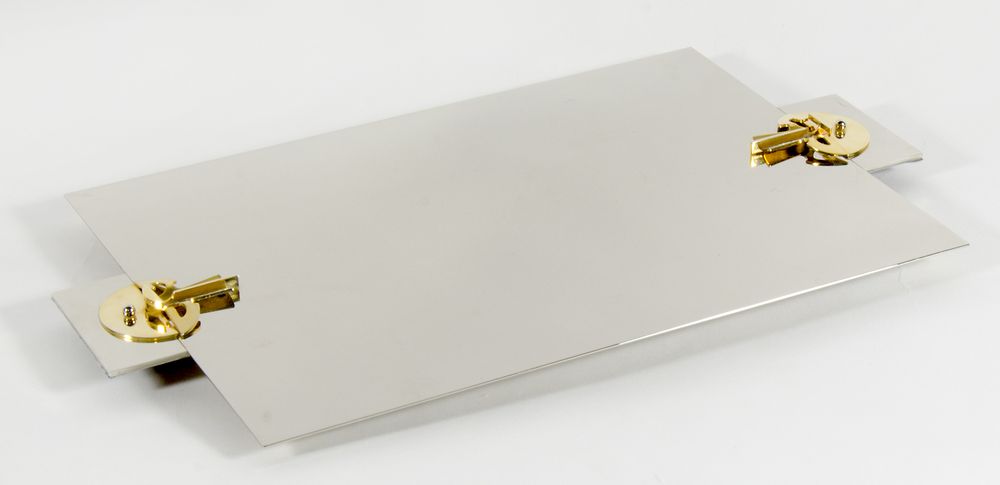 Nado Canuti: vassoio in metallo cromato e dorato. Firma incisa. cm. 22x40.