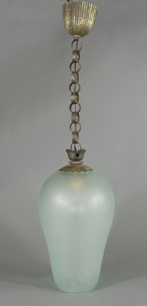 Lotto 276 | Lampada a sospensione in vetro verde pulegoso, struttura in metallo. H. cm. 73.