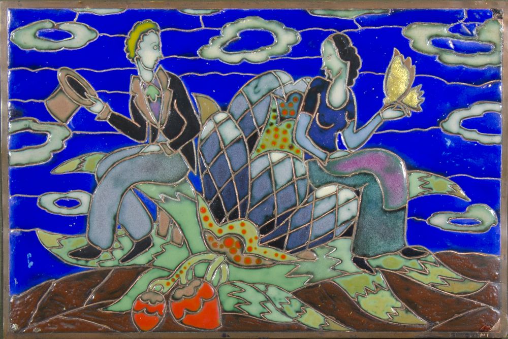 Mario Sturani 1906-1978 "Galanterie di sera" cm. 21x31 smalti policromi su piastra in rame (due lievi mancanze) Firmato b. a d.