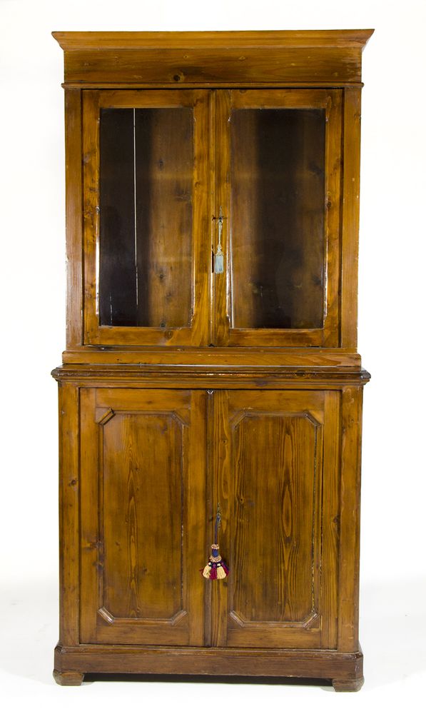 Armadio/vetrina in legno a 2 corpi, parte inferiore a due ante e parte superiore con due ante a vetri. cm. 200x95x40.