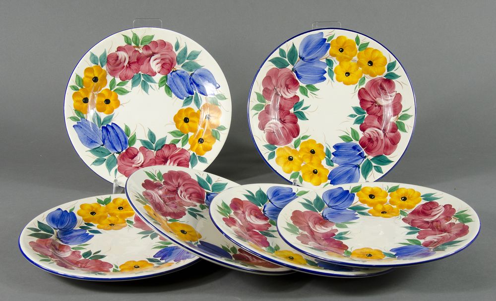 Galvani: lotto di 6 piatti vari in ceramica policroma. Marcati.