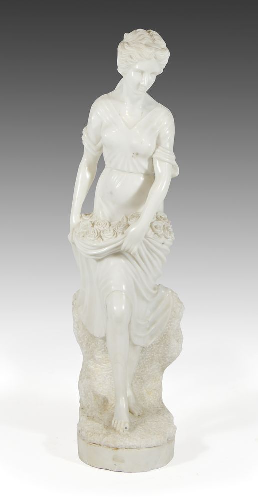 Grande scultura in marmo bianco scolpito raffigurante gentildonna con fiori....