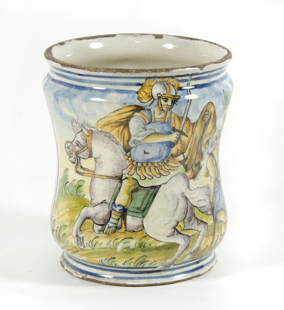 Albarello in maiolica decorato a policromia raffigurante San Martino. Castelli, XVIII secolo. H. cm. 18.