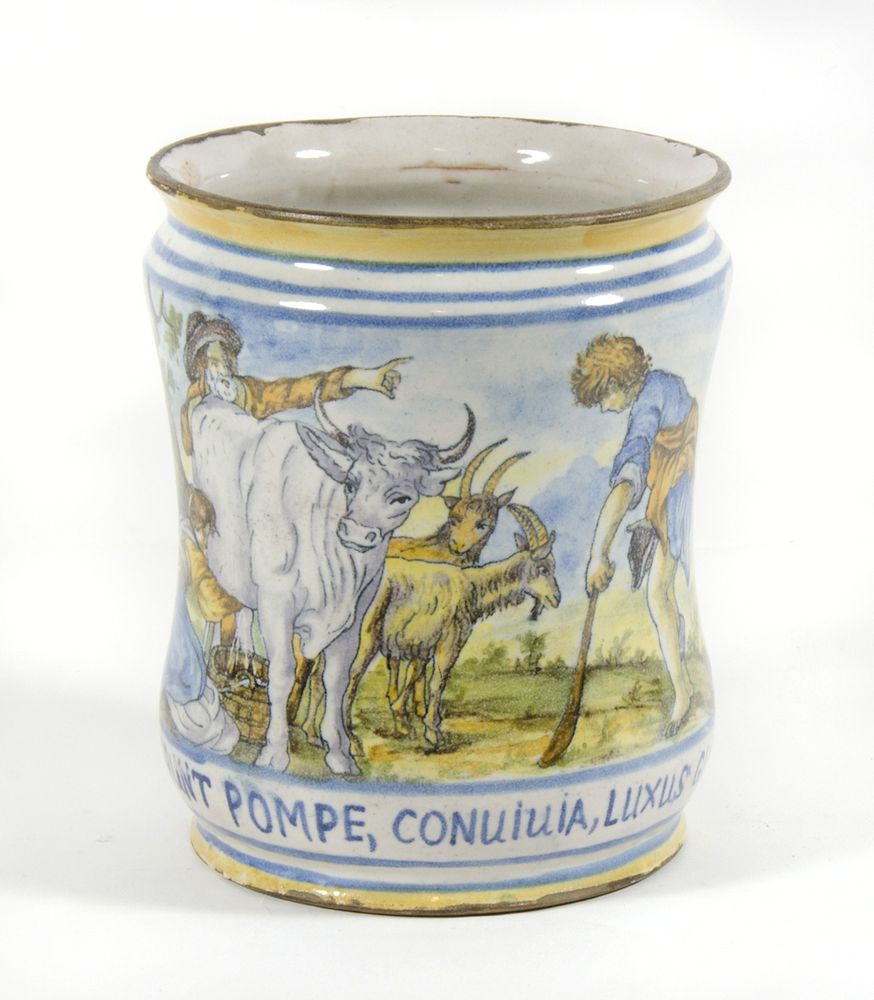 Albarello in maiolica decorato a policromia raffigurante scena bucolica. Castelli, XVIII secolo. H. cm. 18.