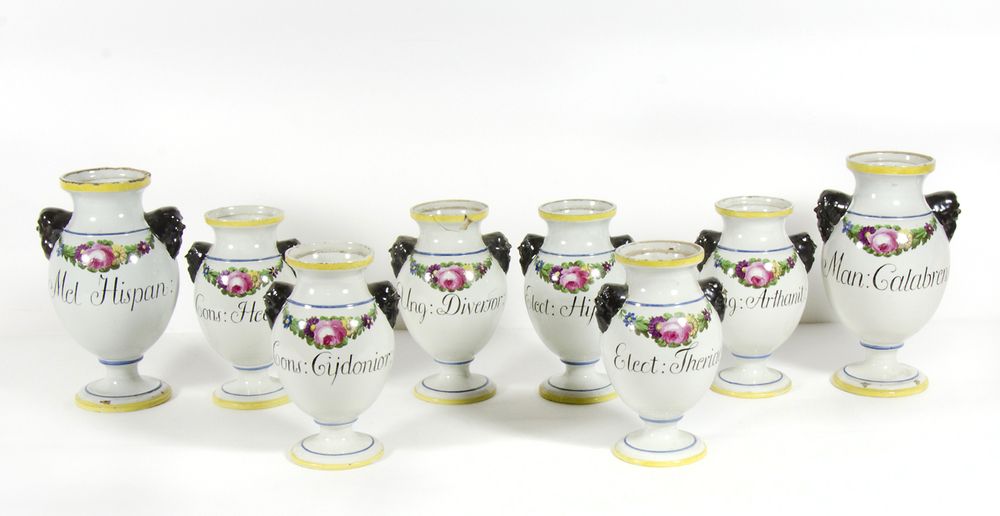 Serie di 8 vasi da farmacioa decorati a festoni floreali, scritte e manici a mascherone. Bassano, XVIII secolo. H. max cm. 21. (difetti).