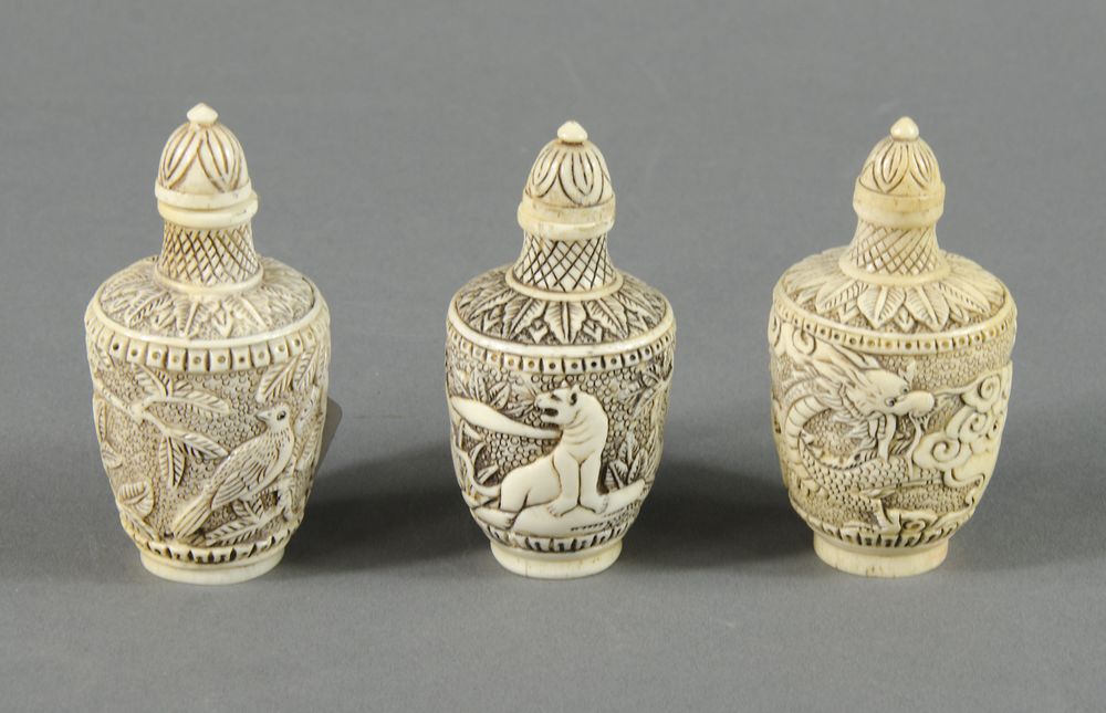 Lotto 447 | Lotto di 3 snuff bottles in osso sbalzato. XX secolo.