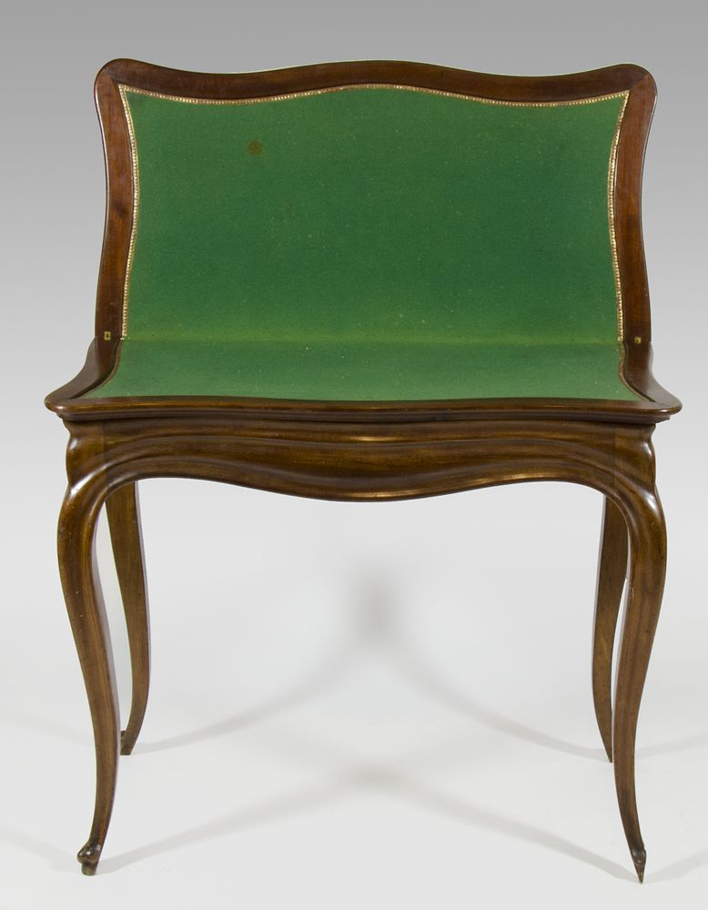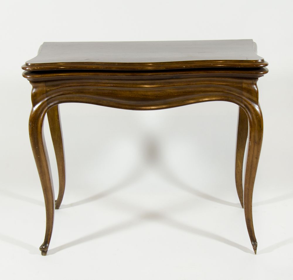 Tavolino da gioco apribile, su alte gambe mosse. XIX secolo. cm. 73x84x42.