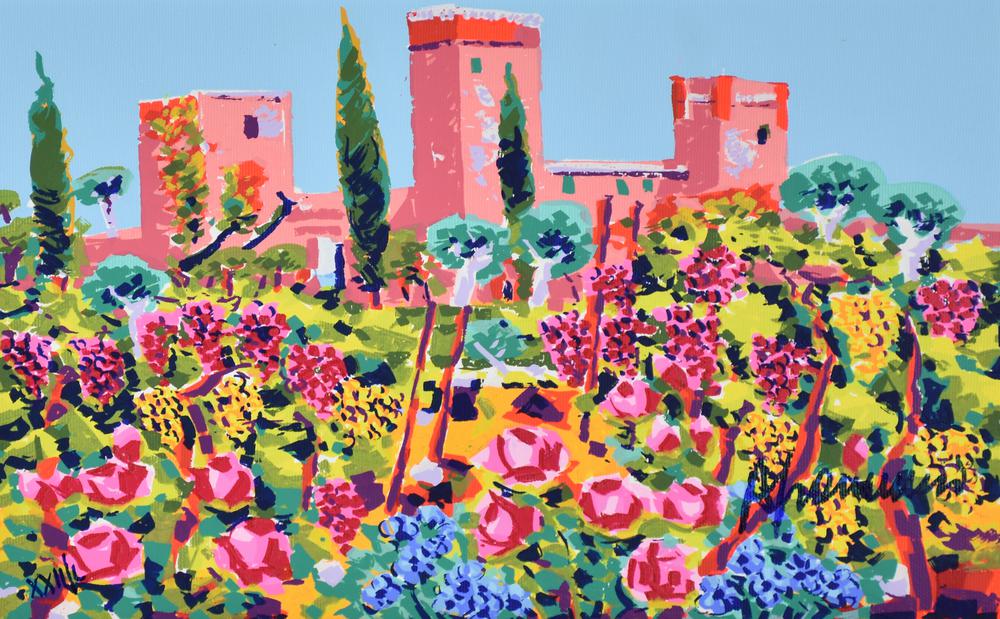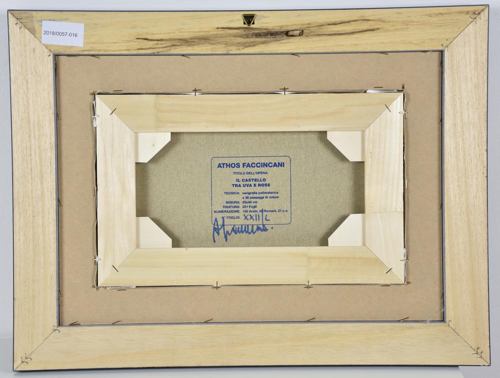 Faccincani Athos, Il Castello tra Uva e Rose serigrafia polimaterica a 36 passaggi di colore su tela, cm 25x40 esemplare XXII su L sul fronte: firma sul retro: firma