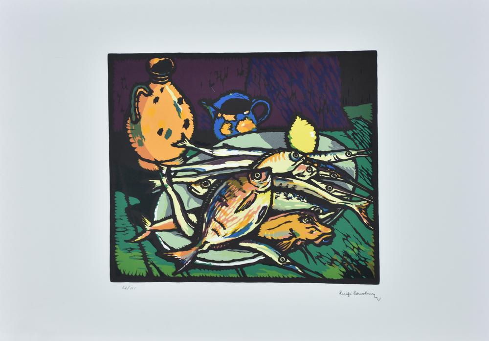 Servolini Luigi, Pesci Cromo xilografia su carta, cm. 50x70 (lastra cm 30x35) esemplare 52 su 125 sul fronte: firma