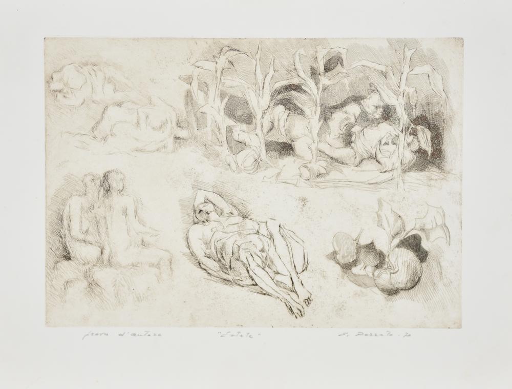 Pozzato Epifanio, Estate incisione su carta, cm 35x50 (lastra cm 25x36) esemplare prova d'autore sul fronte: firma, data e titolo eseguita nel 1970