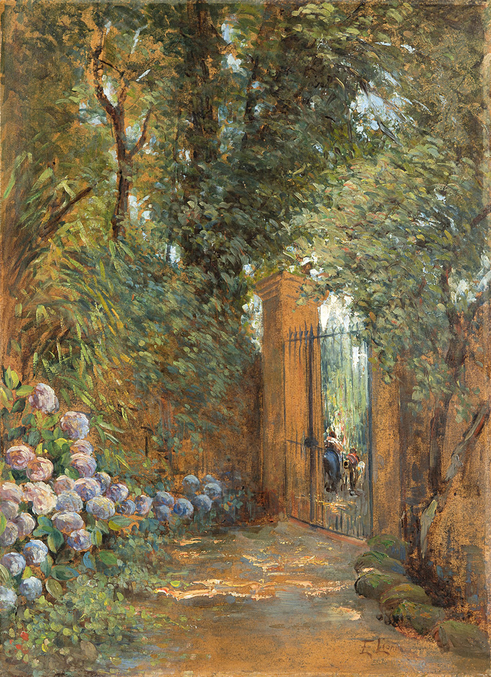 Enrico Lionne (Napoli 1865 - 1921)"Vialetto fiorito"olio su cartone (cm...