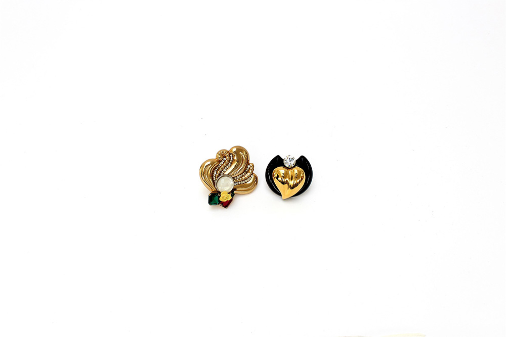 Lotto composto da due grandi anelli in metallo dorato, strass e galalite, uno con motivo a cuore l'altro con pennacchio