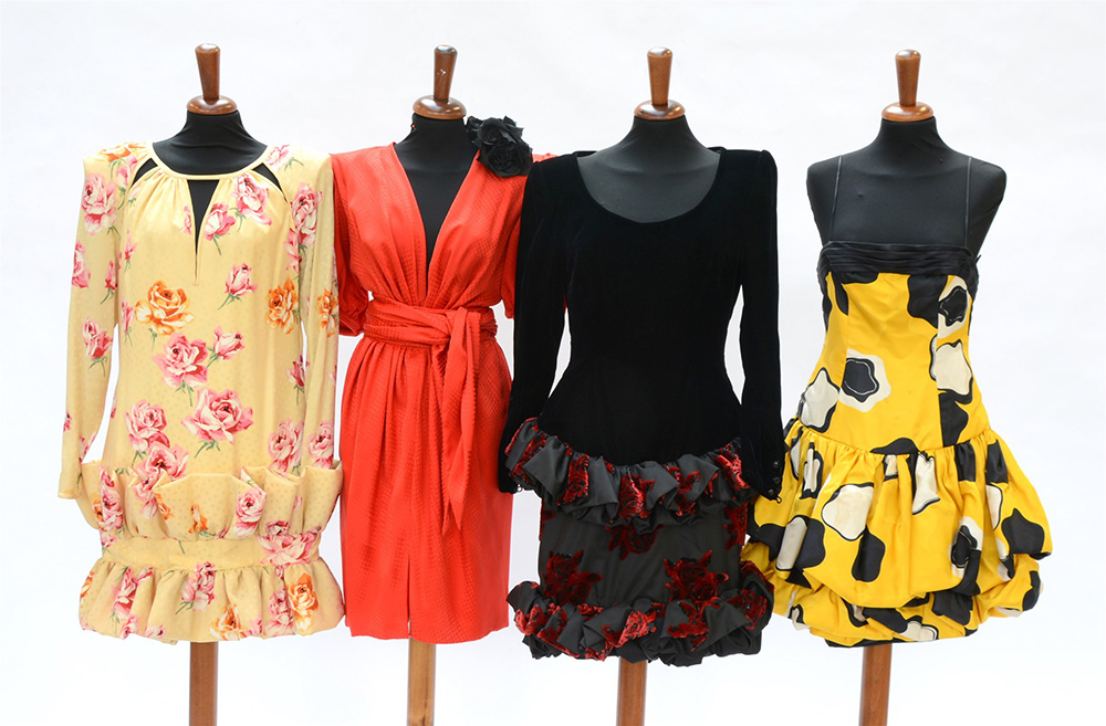 Lotto composto da quattro abiti da cocktail e sera in seta e velluto di diverse fogge e colori (tg. 42/44) (difetti e segni d'uso)