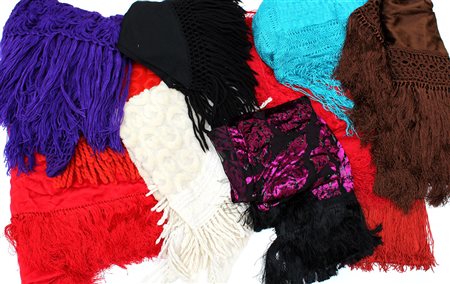 Lotto composto da nove scialli e una sciarpa in vari materiali e colori (difetti e segni d'uso)