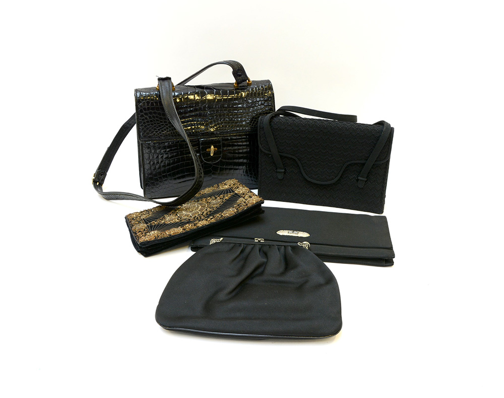 Lotto di cinque borse da giorno e da sera di vari materiali e fogge, tutte di color nero (difetti)