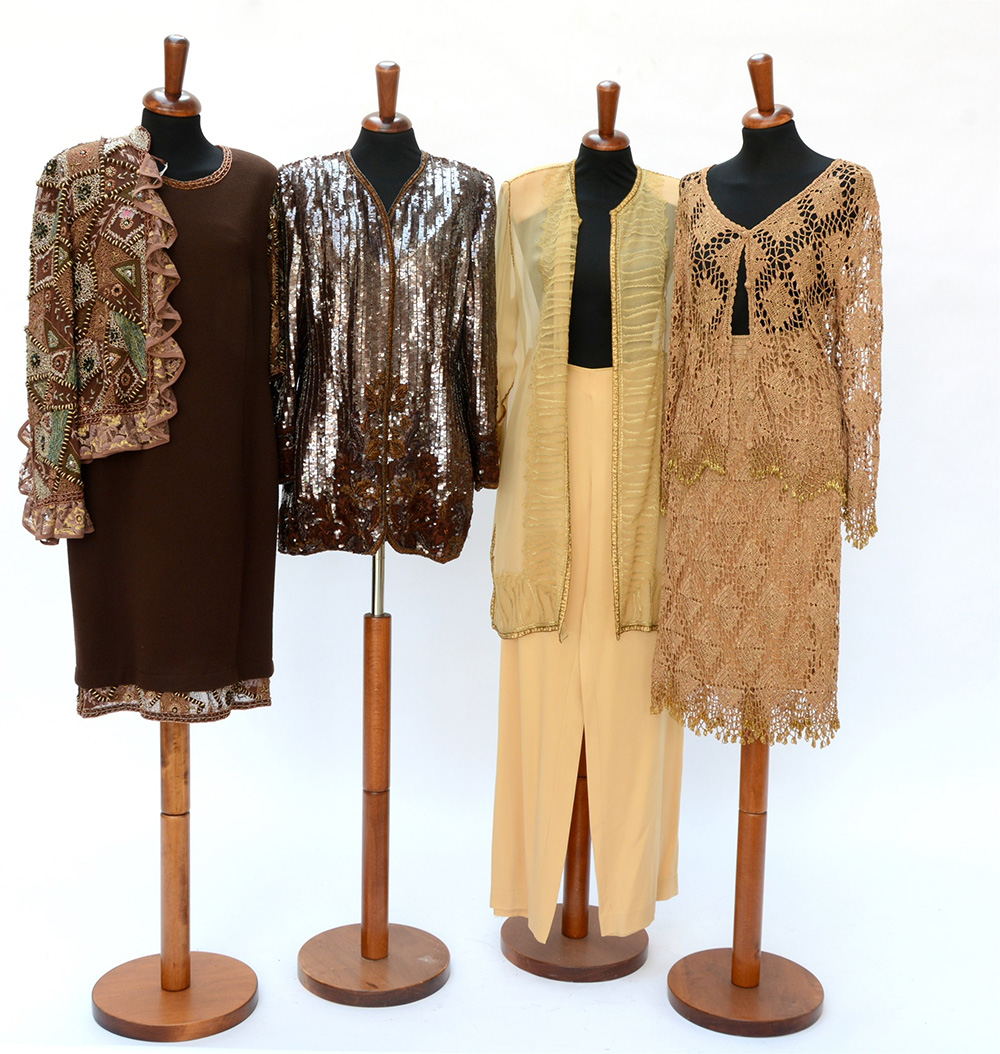 Lotto composto da abito con giacca in seta e paillettes completo in pizzo traforato, giacca in pailletes, pantalone e chemisier (taglie varie) (lievi segni d'uso)