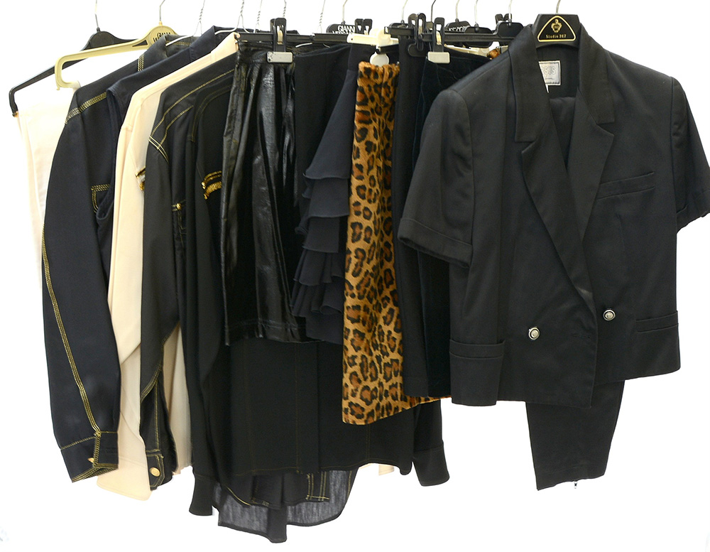 Lotto composto da un competo, giacchino con pantalone, cinque camicie di cui una senza maniche, due paia di jeans, sei gonne nei toni del nero, maculato, avorio (misure varie) (tg. 40/42) (segni d'uso)