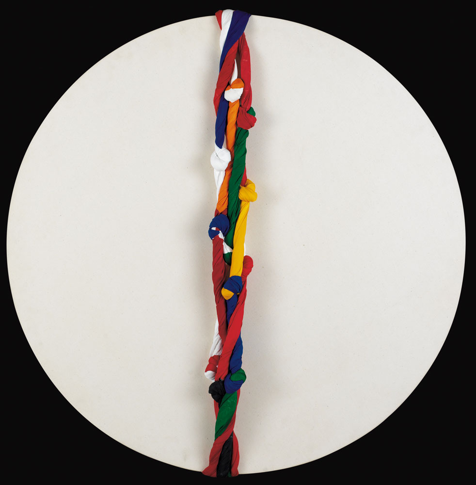 JORGE EIELSON Perù 1924 - Milano 09/03/2006 - Bandiere, 2004 (1998), tele annodate e acrilici su tela applicata su tavola circolare cm. 100x100, firma, titolo e anni al retro, opera registrata presso l'Archivio Jorge Eielson al numero JE 438 come da dichiarazione su foto, opera senza cornice.