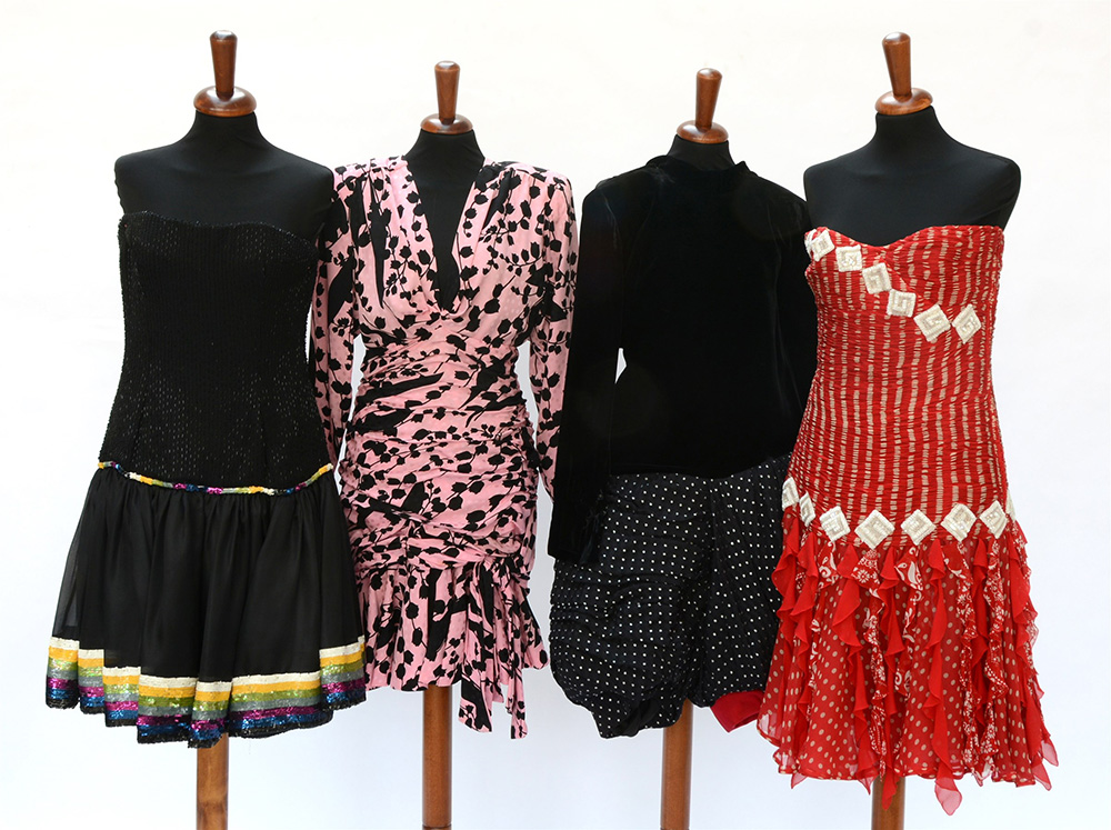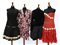 Lotto di quattro abiti da cocktail in tessutii e colori vari decorati con, canottiglie, passamaneria e pillettes (taglie varie) (difetti e segni d'uso)