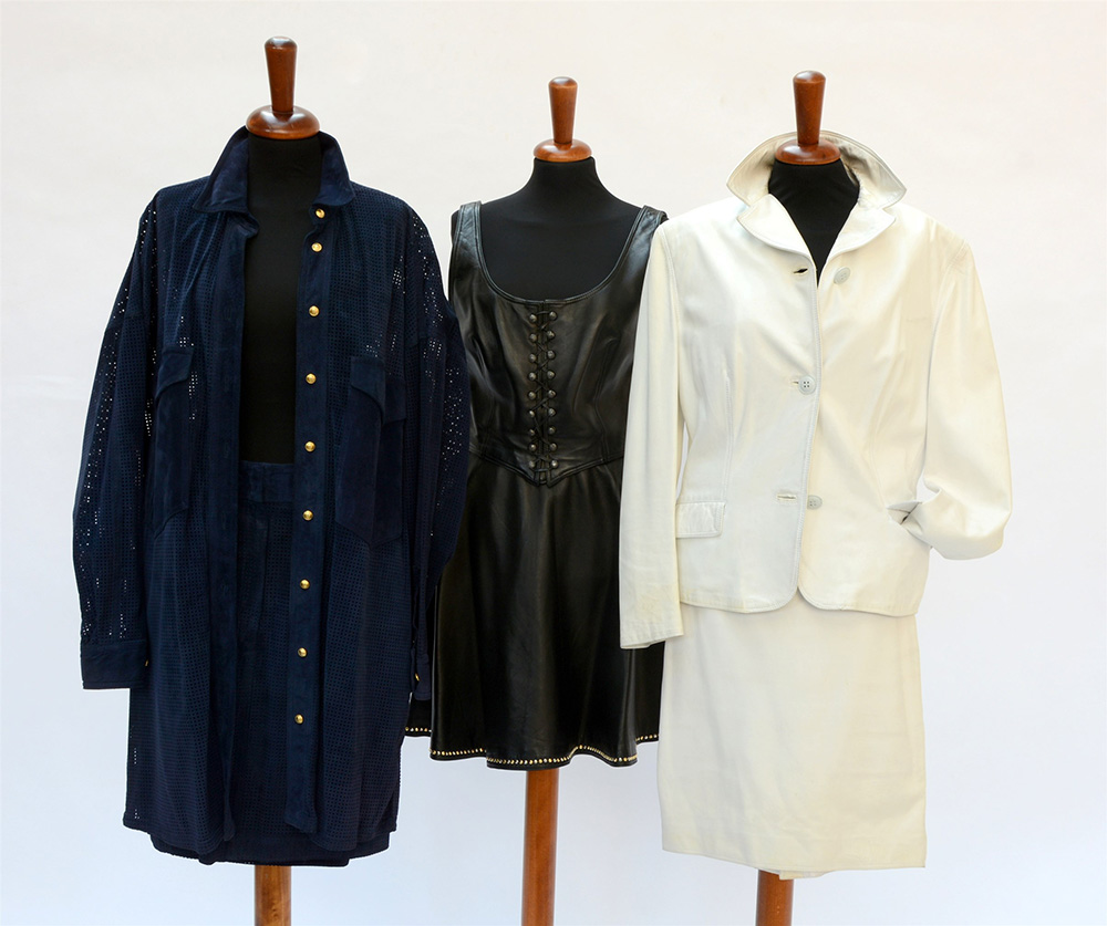 Lotto composto da un tailleur in pelle bianca, un completo in camoscio traforato blu, una gonna in pelle nera rifinita con borchie, un top in pelle nera rifinito con dettagli in mettalo color argento e un'altra gonna (taglie varie) (segni d'uso)