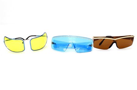 Lotto di tre paia di occhiali di cui uno con lenti azzurrate e strass, uno con lenti gialle in metallo e uno con lenti fumé (lievi segni d'uso)