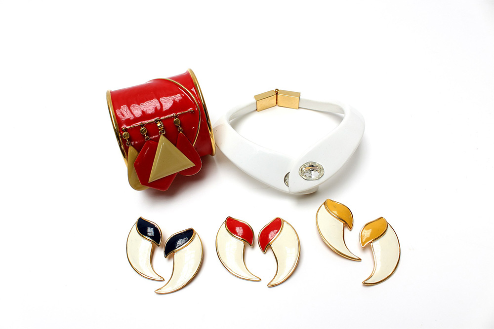 Lotto composto da un bracciale rigido, un collier semirigido e tre paia di orecchini in materiali differenti, rifiniti con strass e smalti (difetti e mancanze)