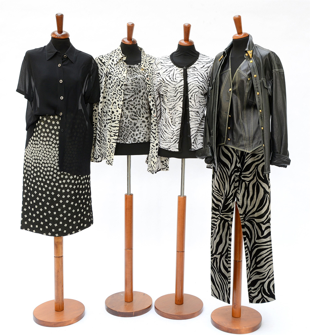 Lotto composto da una giacca in pelle e gilet con dettagli color oro, un paio di pantaloni, una gonna e cinque tra maglie e camicie, tutto sui toni del bianco, nero e grigio, fantasie per lo più animalier (tg. 40/42) (difetti e segni d'uso)