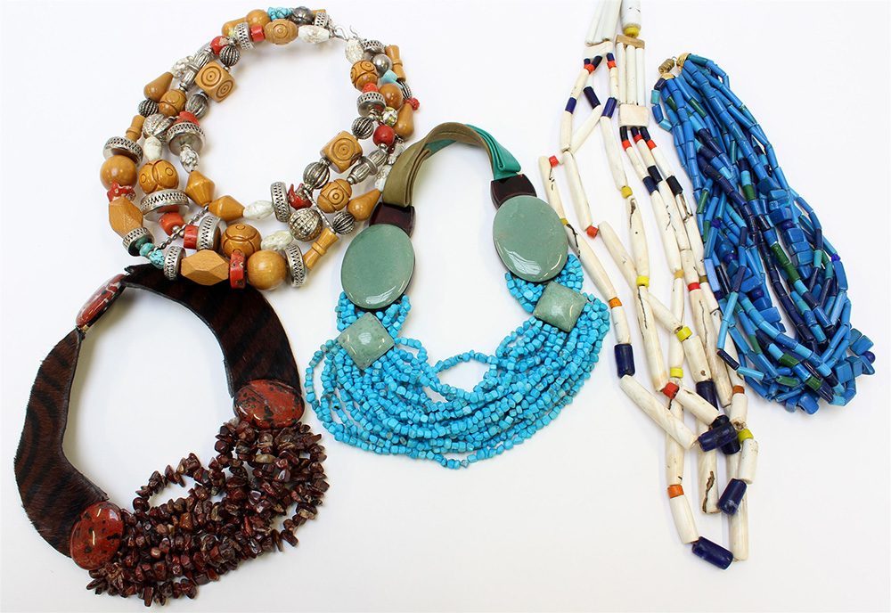 Lotto di cinque collane multifilo in stile etnico, materiali e colori differenti