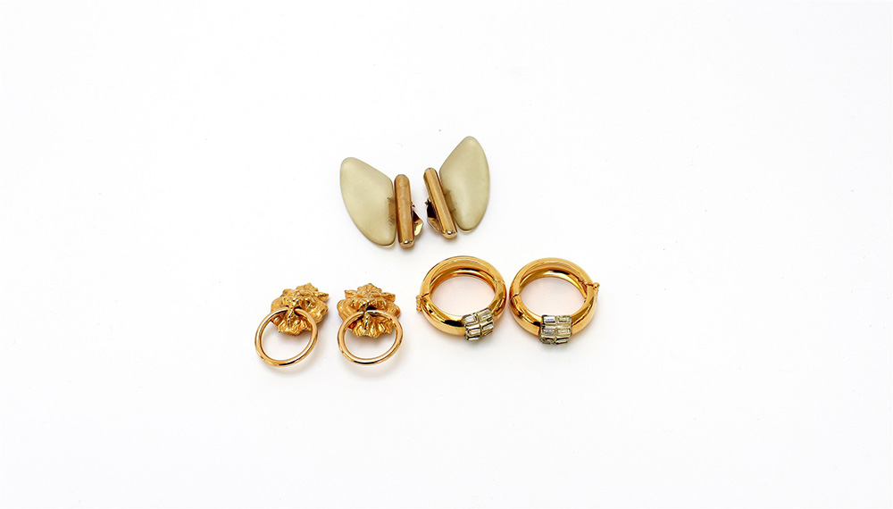 Lotto di tre paia di orecchini a clips in metallo color oro decorati con strass e plexiglass