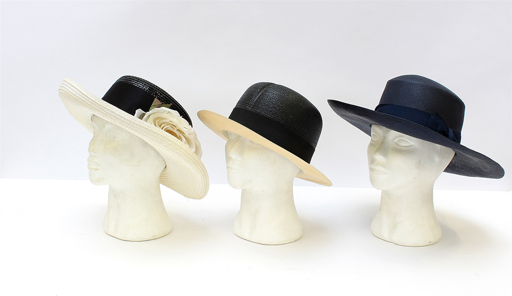 Lotto di tre cappelli a tesa larga sui toni del bianco, nero, crema, blu, uno rifinito con fiore