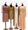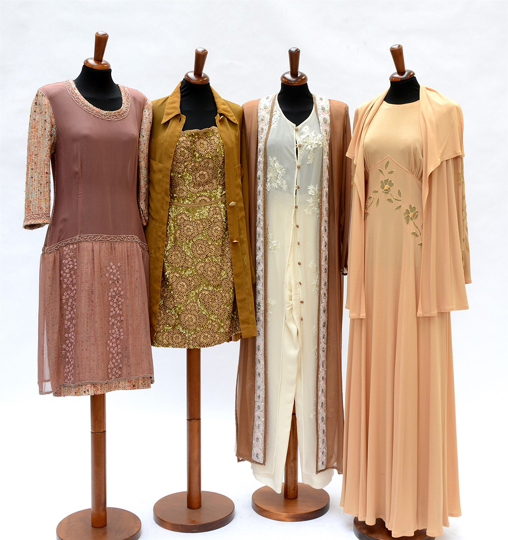 Lotto compoato da due abiti con camicia e uno con spolverino, un vestito e un completo pantalone, scamiciato lungo e sploverino tutto nei toni dal cipria al bruciato (taglie varie) (segni d'uso)