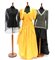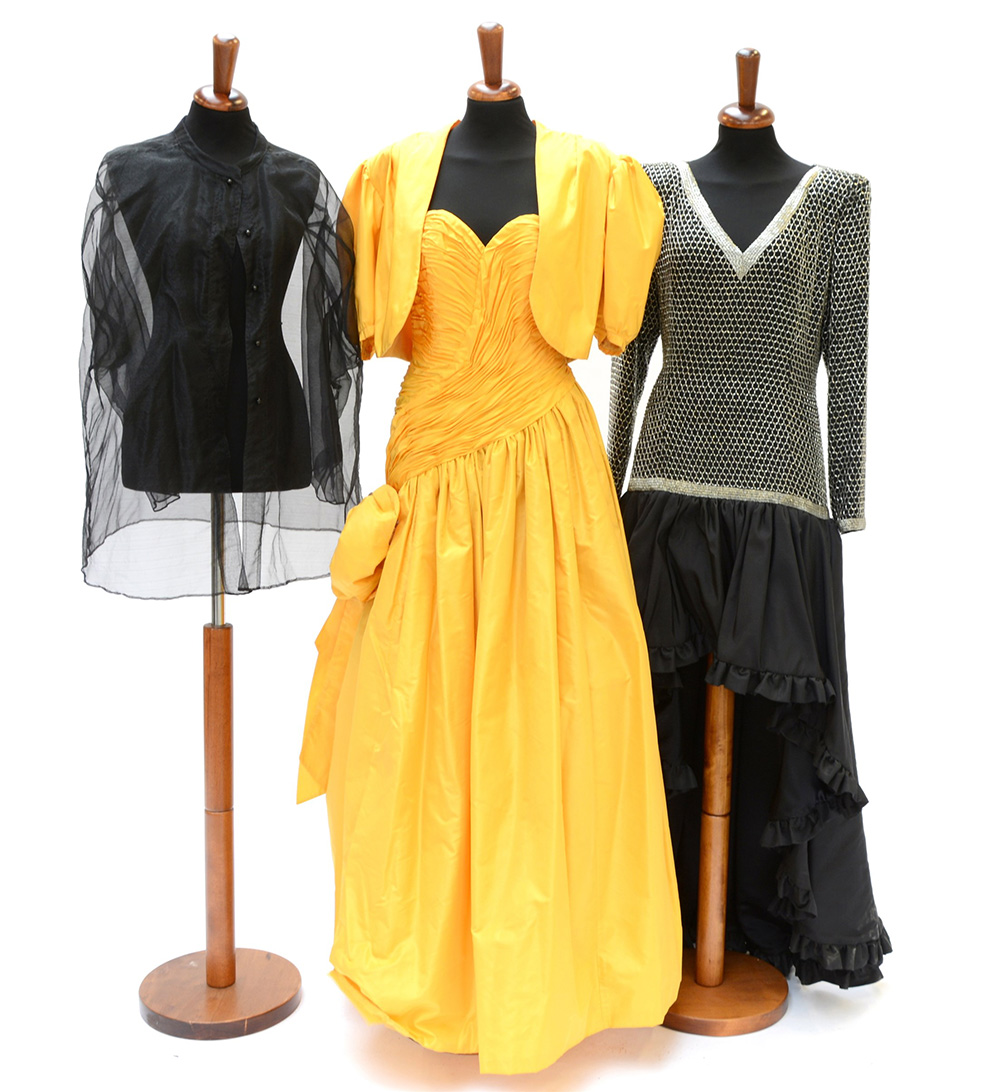Lotto composto da due abiti da sera lunghi uno in taffetas giallo polenta con bolero e l'altro in moiré nero rifinito con cannettiglie color argento con motivo a rete e camicia in voile (taglie varie) (lievi segni d'uso)