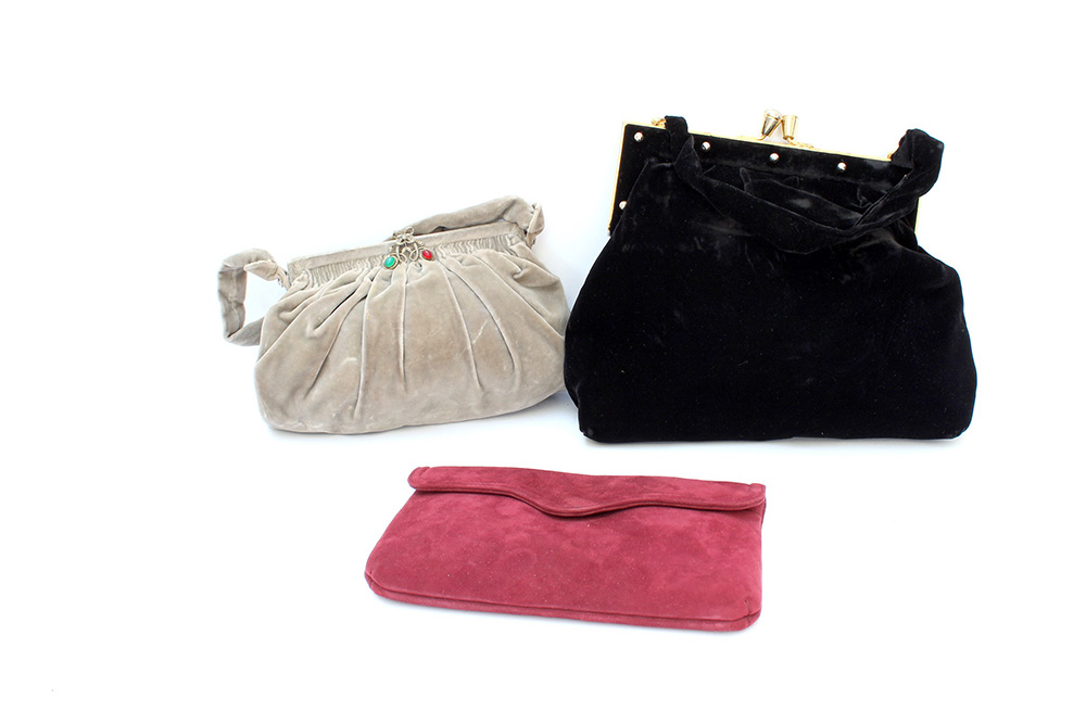 Lotto di tre fra borsette e clutch di cui una in velluto nero, una in velluto grigio con chiusura gioiello e una in camoscio bordeaux, dimensioni e fogge diverse (difetti, segni d'uso)