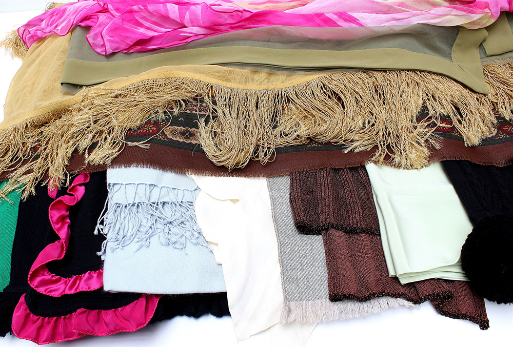 Lotto di dodici tra scialli, sciarponi, sciarpe, mantelle e foulards e pareo di dimensioni, tessuti e colori differenti da donna (gravi defetti)