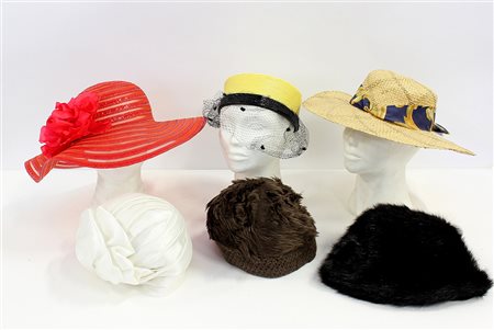 Lotto di sei cappelli invernali ed estivi di forme, materiali e colori differenti (lievi difetti)