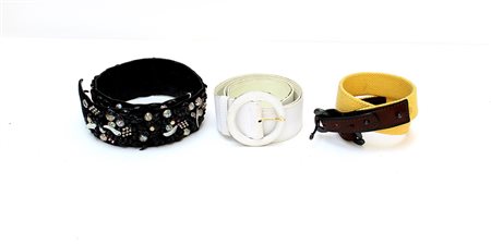 Lotto di tre cinture in vari materiali e colori (difetti e segni d'uso)