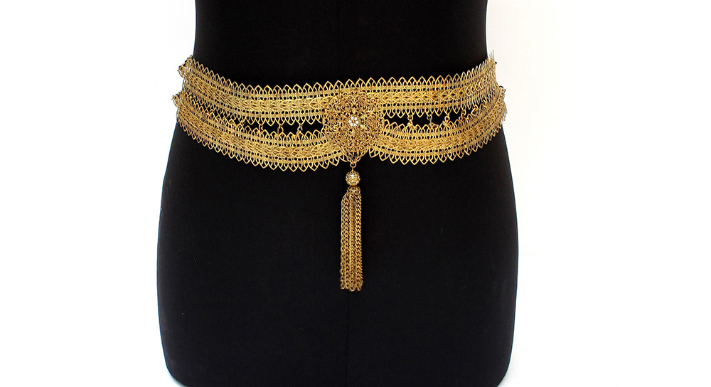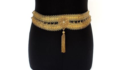 Cintura in metallo color oro con lavorazione a filigrana e battuta, rifinita...