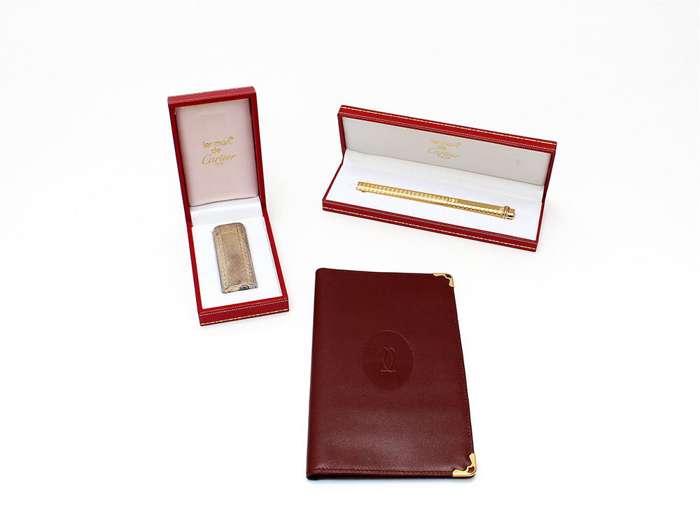 Lot comprising a silver-plated lighter with original guarntee and box, a gilt-plated ball-point pen with original certificate and box and a credit card holder in bordeaux leather (minor signs of wear)