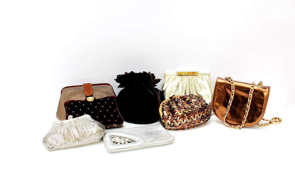 Lotto di otto borsette da sera nei toni dell'argento al mordoré di misure e materiali diversi (difetti e segni d'uso)